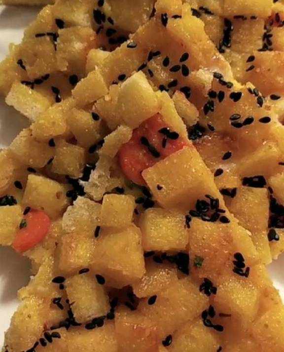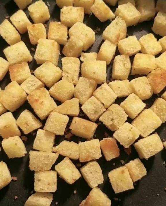 首先准备两个剩馒头切成小丁,锅内起油,油热后把切好的馒头丁放入锅中煎至两面金黄。