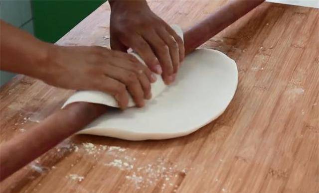 2.面团做好了,继续揉。我的面团比较大。让我们用刀把它切成两等份。现在在砧板上撒一些玉米粉,开始擀面团。平均擀5-6次就换个方向一直擀,用擀面杖把面团包起来,擀的时候要从边往中间用力擀,这样面团擀得均匀。