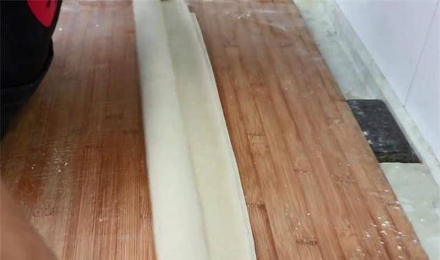 3.面条擀好后,将擀好的面片叠在一起。不要将此区域折叠得太宽,否则您将无法用刀将其全部切割。