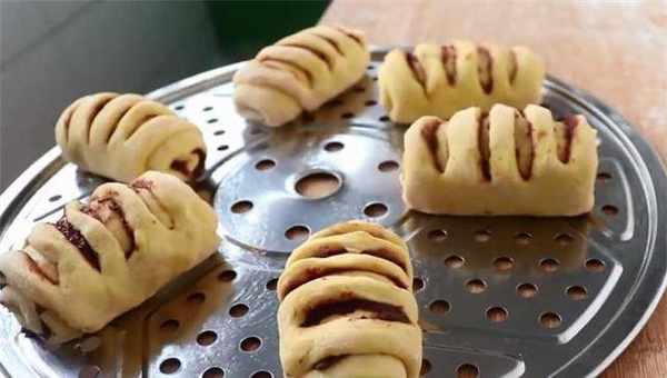 8、一切就绪后,在烤架上刷一层油,将馒头放入蒸10分钟左右,即可上锅蒸熟。