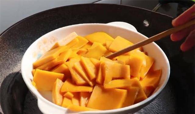 1.准备一小块南瓜,去籽去皮,然后切成小片放在盘子里。锅里的水烧开后,把南瓜放在上面蒸。