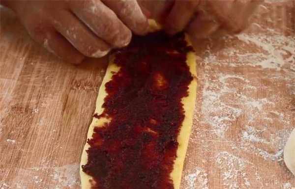 5.在上面刷一层油,然后加入一勺红豆沙,抹匀。