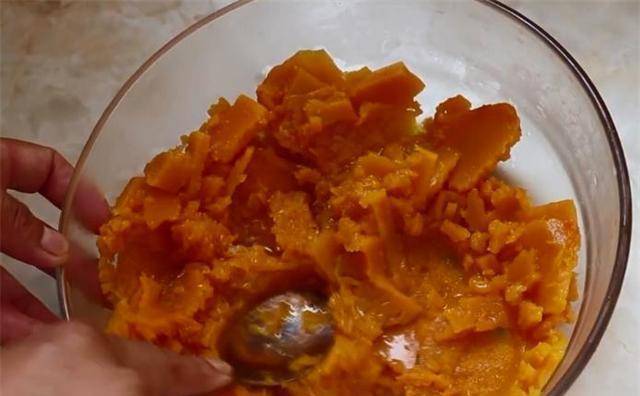 2.现在准备好了。南瓜蒸好后倒入盆中用勺子压成泥,等凉到35度左右。