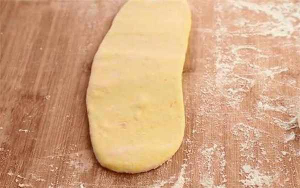 4.面团做好了,在案板上撒些干面粉,把面团倒在案板上,再次揉面。揉的时候加一小勺小苏打,把面团揉在一起,这样馒头会变软。将面团揉成长条,然后切成等份的小面团,将小面团揉成长条用手掌压紧,然后用擀面杖擀成均匀的面皮。