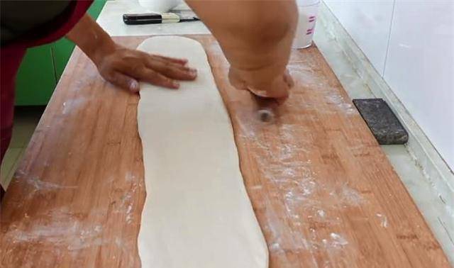 2.现在面团发酵好了,加入一茶匙小苏打,和面团一起揉。案板上撒些干面粉,揉好的面团揉成长条,用手掌压一下,然后用擀面杖擀开,擀成一样的宽度,厚度均匀。