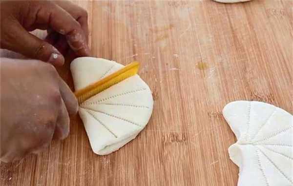 4.在面团上刷一层油,再对折,用干净的梳子或刀叉在上面划几个记号,然后捏成两半。