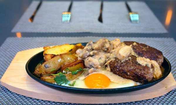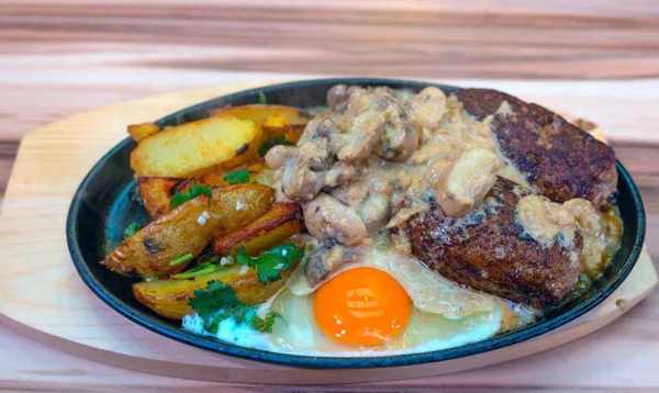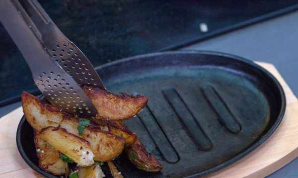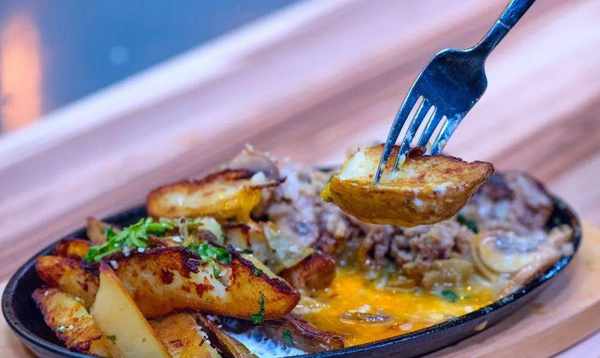将炸薯条放在烧热的铁板上,将炸好的牛肉放在上面。