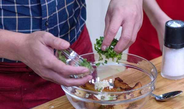 在炸土豆中加入一些切碎的大蒜和香菜。