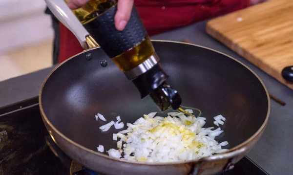 将切好的洋葱放入锅中,加入少许橄榄油炒香。