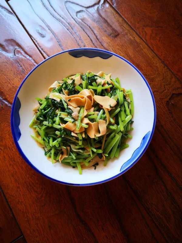 4 放入蒿子秆炒至断生,然后下入豆干翻炒几下