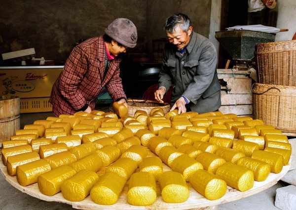 桂东大禾糍,又叫“黄糍粑”,是桂东历史上流传悠久的一种名吃。千百年来,曾以“桂东贡品”的面貌示人。其生产制作工艺比较复杂,加工程序很多,一道道工序环环相扣,且有较高的技术含量,主要大致分为熬碱水、配米、磨浆、蒸熟捣合、成型几个步骤。桂东黄糍粑无任何添加剂,味美香甜、柔韧润滑、色泽鲜黄、烹调方便,蒸、炒、涝、煮、烤均可,加上瘦肉丝、大蒜、香菇等佐料炒食或煮食味道更佳。不仅是招待客人的美味佳肴,也是给人送礼的佳品。