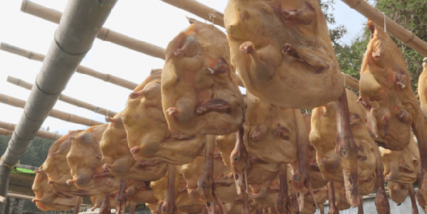 桂东板鸭以本地产麻鸭宰杀后剖褪干净,用砂姜、八角、食盐粉搓遍,置于太阳底下暴晒成干。由于桂东生态良好,所产鸭子肉厚个大,再加上传统的秘制方法,板鸭具有香、脆、甜等特点,外形美观,回味深长。食用时,蒸、煎、炒均可,是桂东传统待客佳品。