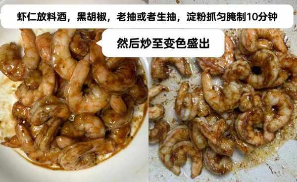 第五步:锅底加入少许橄榄油,油慢慢烧热,倒入腌好的虾仁,快速翻炒至变色,加入半勺料酒去腥,快速翻炒-炒匀,备用。