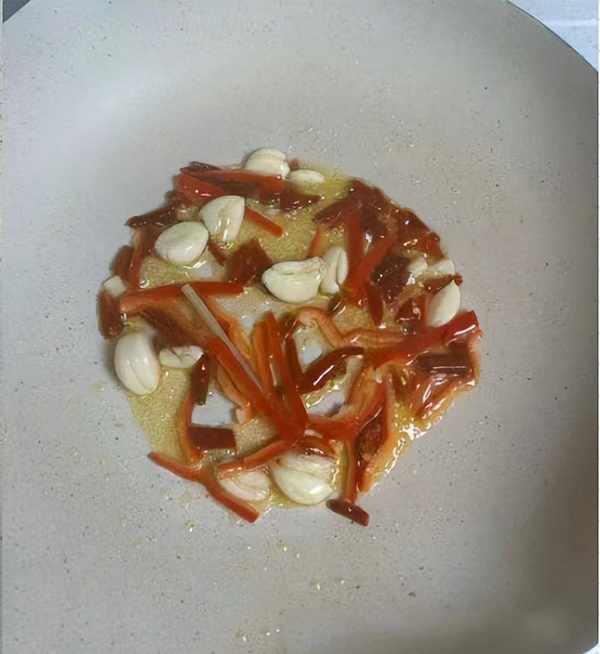 第六步:锅内留少许食用油,放入芹菜、洋葱丝和干辣椒,放入蒜片爆香,翻炒片刻。