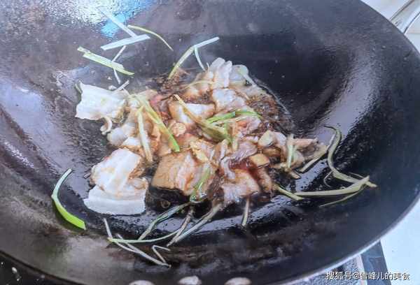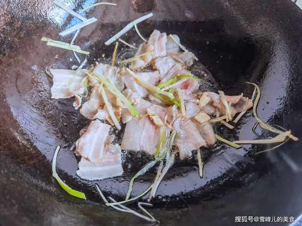 第五步:锅里放入花生油,放入五花肉炒制出油脂,放入葱姜丝炒香。