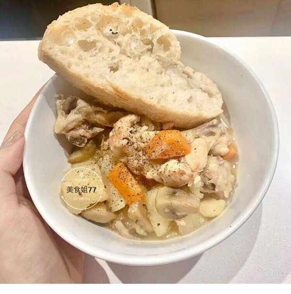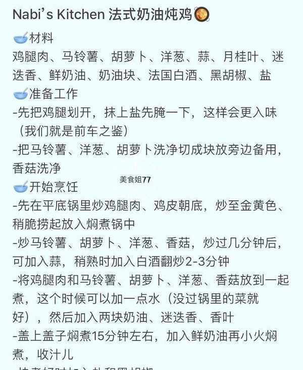 观看这图片,我都觉得好有食欲,法式奶油炖鸡食材搭配很丰富,有鸡腿肉、马铃薯、胡萝卜、洋葱、蒜、月桂叶、迷迭香、鲜奶油、奶油块等等。