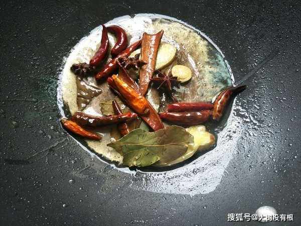 4、开火架锅,待油热后,依次加入辅料爆炒,炒出香味。(不包括盐、生抽、老抽、冰糖)