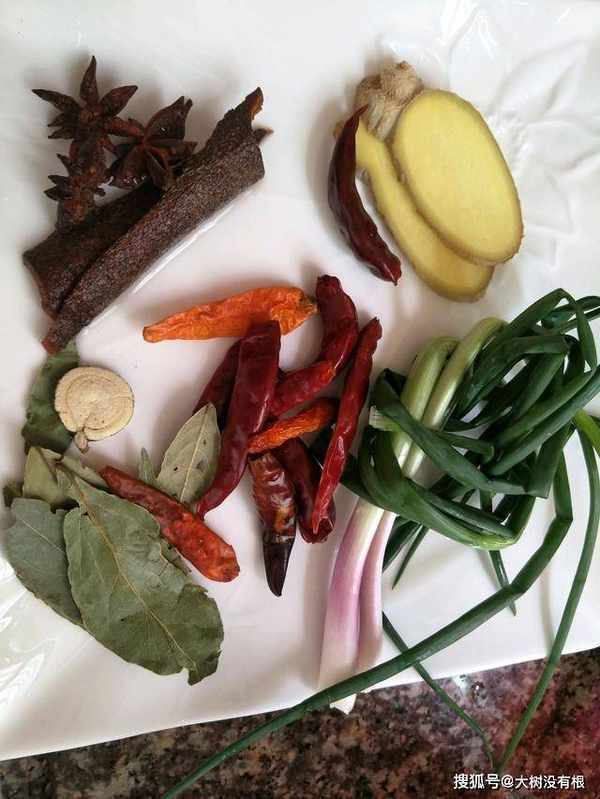 3、准备需要的辅料,香葱、花椒、干辣椒、八角、桂皮、冰糖、香叶、甘草、老抽、生抽、盐,如果喜欢吃黄豆,可以提前冷水泡好,别嫌麻烦,少了其中一样不出味。