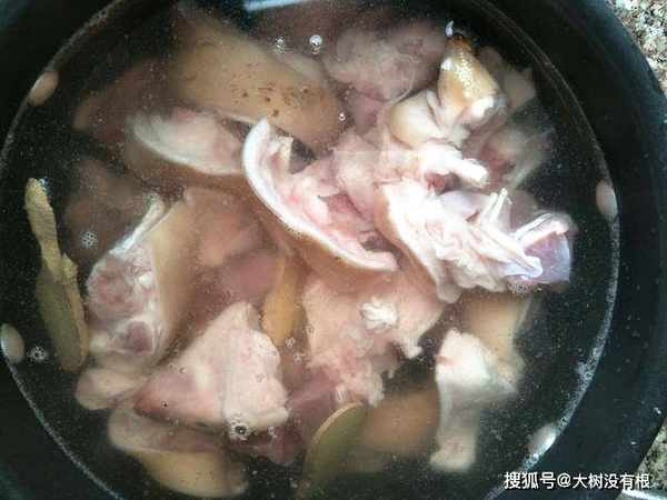 6、加开水没过猪蹄,锅内猪蹄的三分之二即可,到处生抽20克、老抽15克。香葱,盖上锅盖,焖煮35分钟。