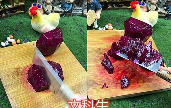 接下来就是文科生切的火龙果,这个火龙果是熟透了吧,红的都发紫了,文科生就是先将火龙果削了皮,不过这皮削的有点厚啊,这是家里有矿吧!之后将削好皮的火龙果切成不规则的块块,这样就可以直接拿牙签吃了吧。