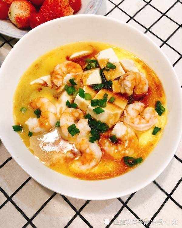 食材准备:大虾、水豆腐、土鸡蛋、葱花。