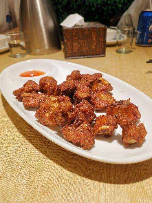 蒜香排骨,猪小排被炸制得焦黄酥脆,口味有点像奥尔良,就是份量有点少,蘸着酱汁一起吃,也算是特色菜品。