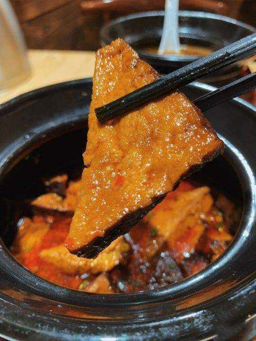 焖罐五香干,五香干先炸制,再用调味的酱汁和焖罐一起焖,外酥里嫩,里面的酱汁全都被香干吸收,咬一口爆汁的那种,基本上每桌必点。