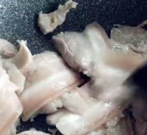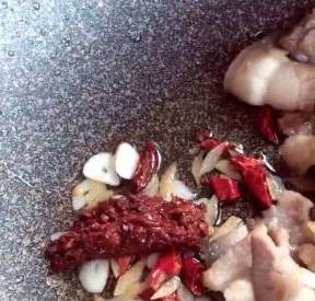 把肉切成小片,热锅加入适量食用油,把肉放进去,炒得稍微变色,然后把肉放在一边,把葱、姜、蒜片、和豆瓣酱放进去,翻炒均匀。