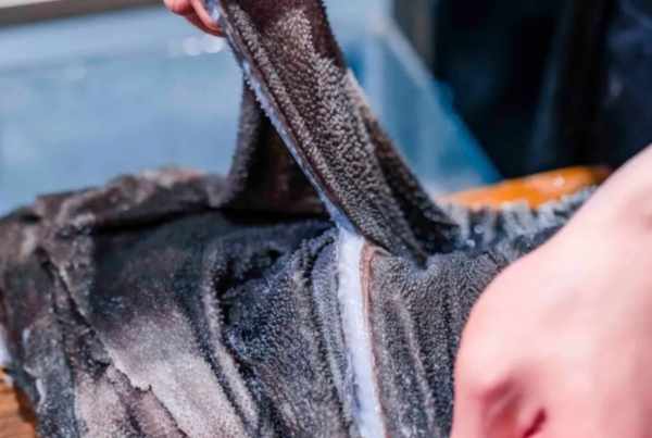 服務員將毛肚推到火鍋前,用手撕下之後,切成絲,細節做得很到位,就連切毛肚的刀也都是冰凍過的,以免刀的溫度過高,影響毛肚的口感,然後用蘇打水加冰塊浸泡一分鐘,這樣的操作保證毛肚脆感。