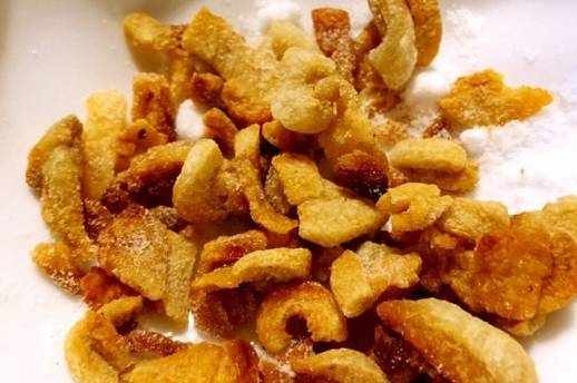 猪油渣,过去每次家里做卤面或是炼大油(猪油)的时候,都会炒一盘猪油渣,黄焦香脆,真是香死了!撒点盐后来在放点孜然粉~那味道和现在的什么炸鸡皮有一拼~
