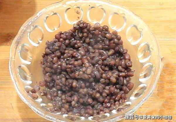 1.准备红豆100克,提前一天泡上,红豆最好提前浸泡能更快煮熟。锅内加水,把红豆放入锅中,先开大火把水烧开,再转小火煮30分钟,把红豆煮熟煮软,捞出沥干水分备用。