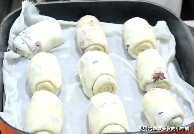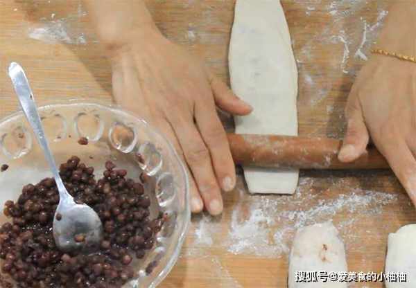 5.放上适量的红豆泥,从底部开始向上裹,裹成条状以后压扁,擀成舌状卷起来,把接口处捏实,红豆卷就做好了,用细布盖住再发酵10分钟,二次发酵红豆卷更有弹性暄软。