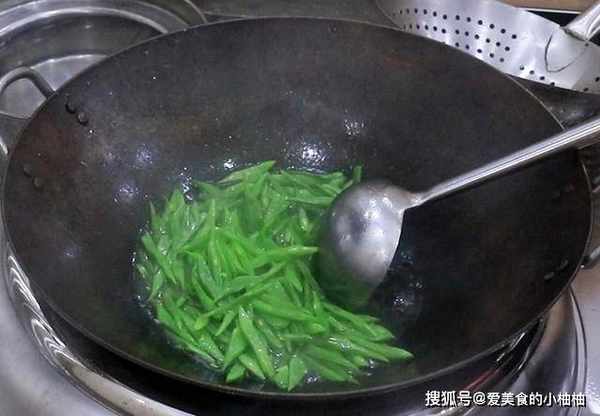 4.锅内烧水,放入少许植物油,植物油能在四季豆表面形成油膜,防止其营养成分流失,水烧开以后把四季豆倒入锅中,煮2分钟左右,四季豆煮熟、返青以后倒出来,快速用清水冲洗降温,以免四季豆回软。