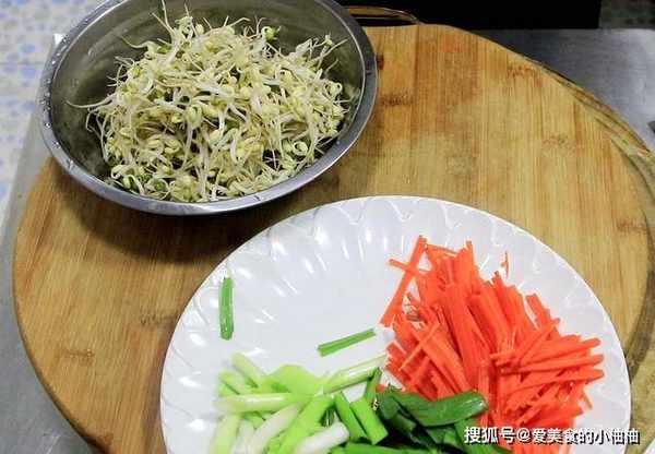 1.准备胡萝卜半根,先切成均匀的薄片,码成一排切成细丝。蒜苗几根,拍散后斜刀切成小段,和胡萝卜放在一起用来配色。豆芽200克放入盆中备用。大蒜几粒,拍散后切成蒜末。