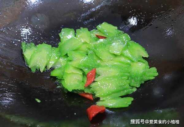 3.锅内加少许底油,倒入控干水分的苦瓜翻炒几下,加入食盐2克,加入一点白糖中合一下苦味,继续翻炒化开调料,再勾入一点水淀粉,让调料更好地吸附在苦瓜上面,淋入少许明油提亮色泽,翻匀后即可出锅装盘。