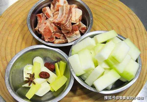 1.准备猪排骨一块,先用砍刀从中间砍开再剁成3厘米左右的小块。冬瓜一块削去外皮,切成小方块,大葱白一小段,切成葱段。生姜一小块,切成姜片放在一个盆中,抓入两粒大红枣,一粒八角备用。