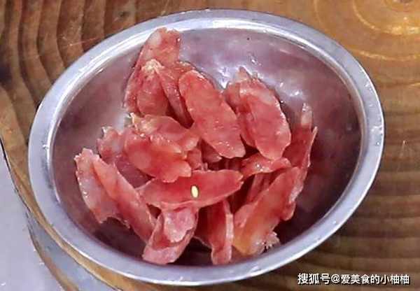 2.锅内烧水,放入两根腊肠,焯水2分钟左右,把腊肠倒出来用清水冲洗干净,焯水主要是为了减少腊肠的咸味和硬度,把腊肠的外皮揭掉,斜刀切成片备用。