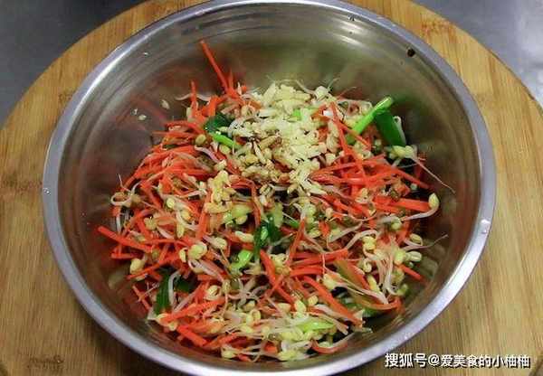 3.把控干水分的胡萝卜、蒜苗、绿豆芽倒入盆中,加入切好的蒜末,加入食盐2克,味精1克,生抽5克,陈醋2克,最后淋入适量的辣椒红油增加色泽,翻拌均匀后即可装盘。