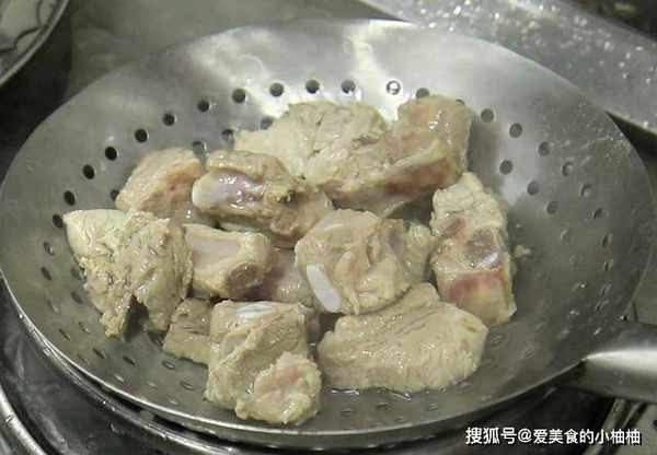2.锅内烧水,倒入一勺料酒,凉水下入排骨,水开后焯水2分钟,沿锅边打去浮沫,排骨焯好以后捞出来快速用清水冲洗,清水冲洗能进一步洗去排骨上面的杂质。