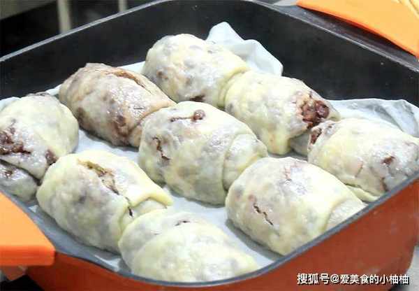6.红豆卷发酵好以后电蒸锅,锅内加水,铺上一层湿的白纱布,铺白纱布是避免红豆卷蒸熟以后粘在锅内不好取,红豆卷凉水摆放在篦子上,两个红豆卷之间要留一点空隙,避免红豆卷遇热膨胀变大粘在一起,大火蒸制15分钟即可。