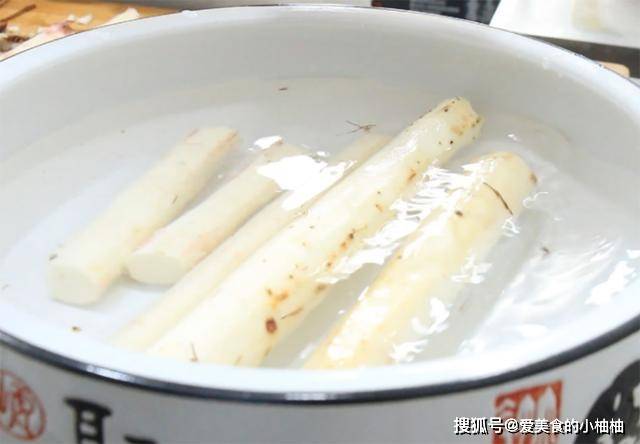 2.准备一盆清水,倒入白醋5克,山药几根切成长段,把外皮削干净,放入盆中隔离空气,避免山药变黑。