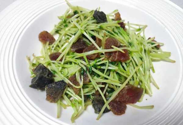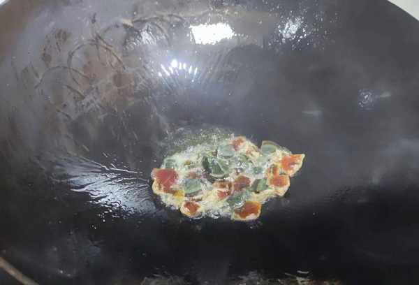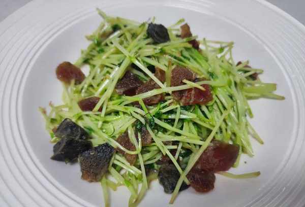 很快,一份非常新鲜的豌豆苗炒鸡蛋就做好了。皮蛋有点新鲜,再和豌豆芽一起炒,味道更鲜美。咬一口豌豆芽,鲜味酸酸的,特别脆,很好吃。