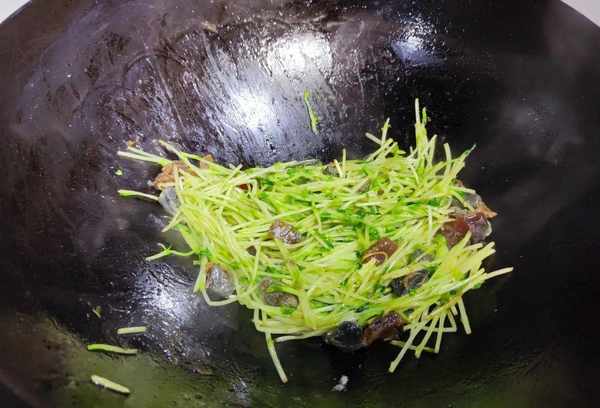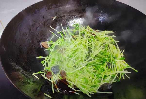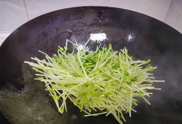 3、炒好后,我们把豌豆苗放入锅中。豌豆苗里的水分很高。下锅后,要大火快炸,要经常翻动;
