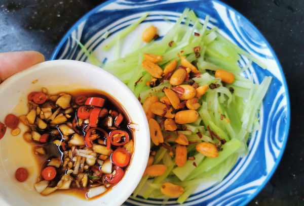 【原料】:生菜2个,小米椒2个,水煮花生1勺,大蒜1个,黄飞鸿麻辣花生2勺,六月鲜淡盐原味酱油2勺,香油半勺,香油半勺盐。