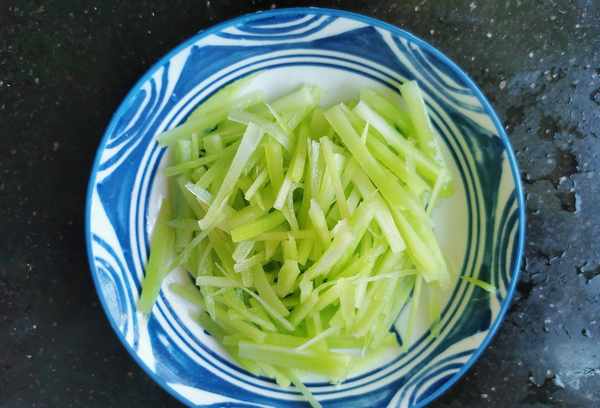 2.生菜去皮,切成生菜丝,上面撒少许盐,腌3分钟,放凉煮开,捞出装盘。