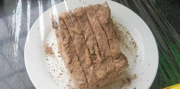 第五步:切好后,再把刚刚调好的料涂抹在肉上,皮那一面不用抹,用手把它涂抹均匀一点,刀口的空隙中也要给它抹一些,这样好入味,涂抹均匀后直接封上保鲜膜,腌制三个小时以上,天气冷的话可以不放冰箱里,如果是热天做,一定要放冰箱冷藏,不结冰的那一层。