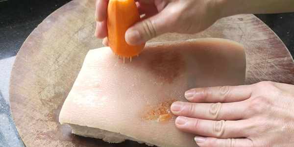 第三步:提前准备一个扎孔的工具,没有工具的,可以用胡萝卜和牙签来做一个,肉煮好后,用筷子插一插,能轻松插进去就可以了,然后把它夹出来,放到水中清洗一下,把表面的杂质冲洗干净,洗净的五花肉擦干水分后就可以给它扎孔了,多扎几下,做出来的效果会更好哦。