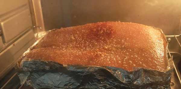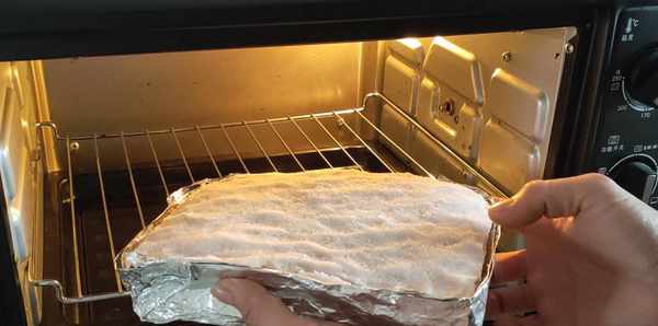 第六步:五花肉腌制好后拿出来,现在用锡纸把它包起来,皮朝上,皮这一面不用包,把它整理成如下图这样就可以了,现在在猪皮上给它刷上一点白醋,醋不用多,均匀的涂抹到了就可以了,接着再往上面给它撒上一层盐,家里有粗盐的话,也可以用醋盐来,薄薄的一层盐铺满整张猪皮就行。