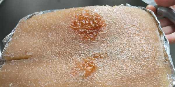 第八步:20分钟后,把五花肉端出来去除掉表面的盐,用刀把它刮下来就可以了,要尽量把盐清理干净一点,要不然做出来的成品会太咸的,但不能用水洗哦。