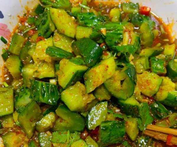 然后是番茄炒蛋,这可是赵曼乔最喜欢的一道菜,也是她的拿手菜,鸡蛋炒得很香,番茄也很软糯,酸酸甜甜还有不少汤汁,倒一些在米饭上,可以多吃一碗饭。凉拌黄瓜也很好吃,黄瓜不要用刀切,而是拍碎,这样更入味,一点辣椒油配点小米辣就很开胃,再来一点香菜提香,味道更好,脆口而不腻,也是赵曼乔经常做的一道菜。